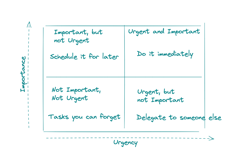 Effective prioritization is key to managing time well. The Eisenhower Matrix is a decision-making tool that helps you prioritize tasks by categorizing them into four quadrants based on their urgency and importance. It was popularized by Stephen Covey in his book “The 7 Habits of Highly Effective People” and is named after Dwight D. Eisenhower, the 34th President of the United States.