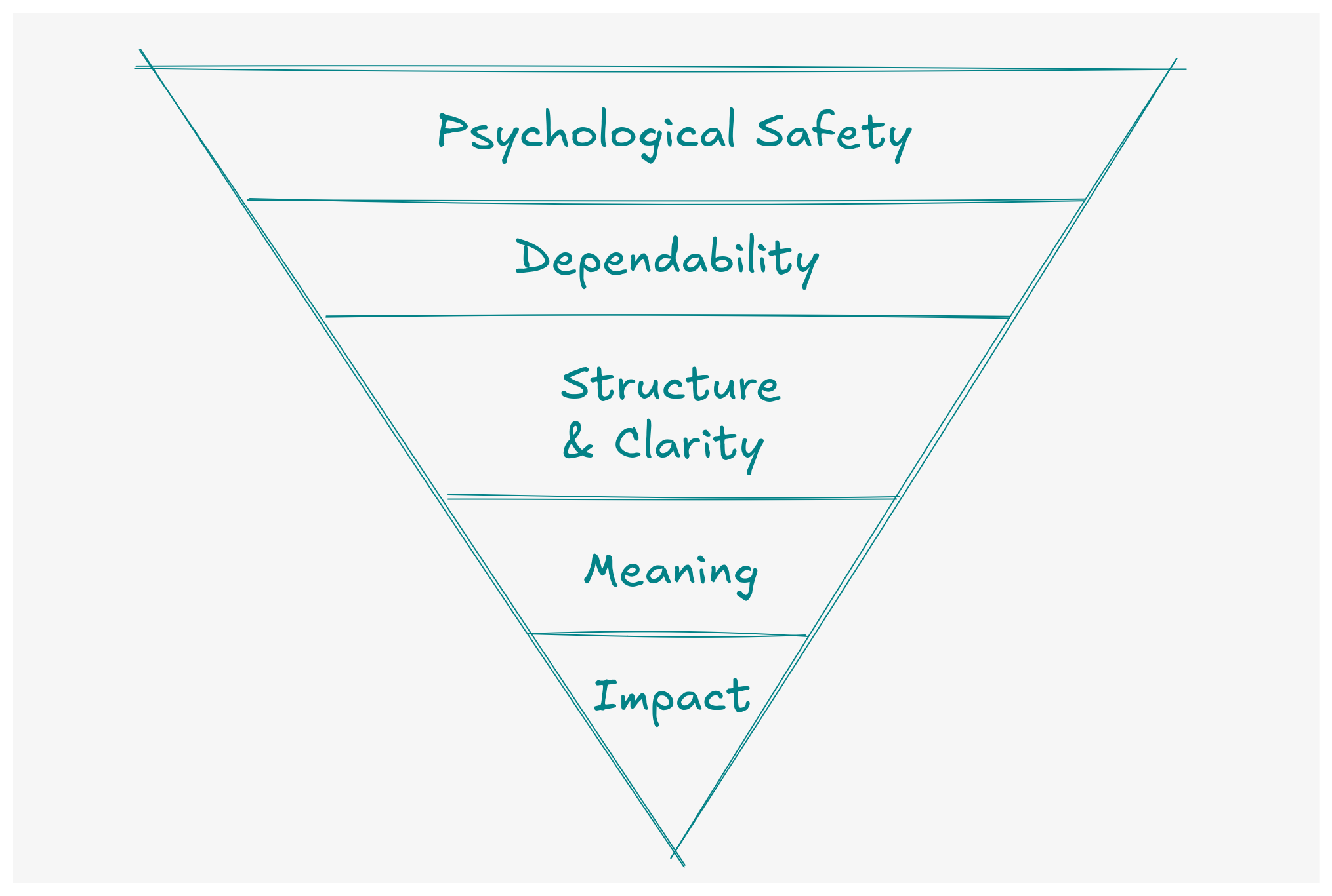 Let’s look at how Google builds high-performance teams. They focus on psychological safety, dependability, structure and clarity, meaning, and impact. These five factors create a strong foundation for team performance.