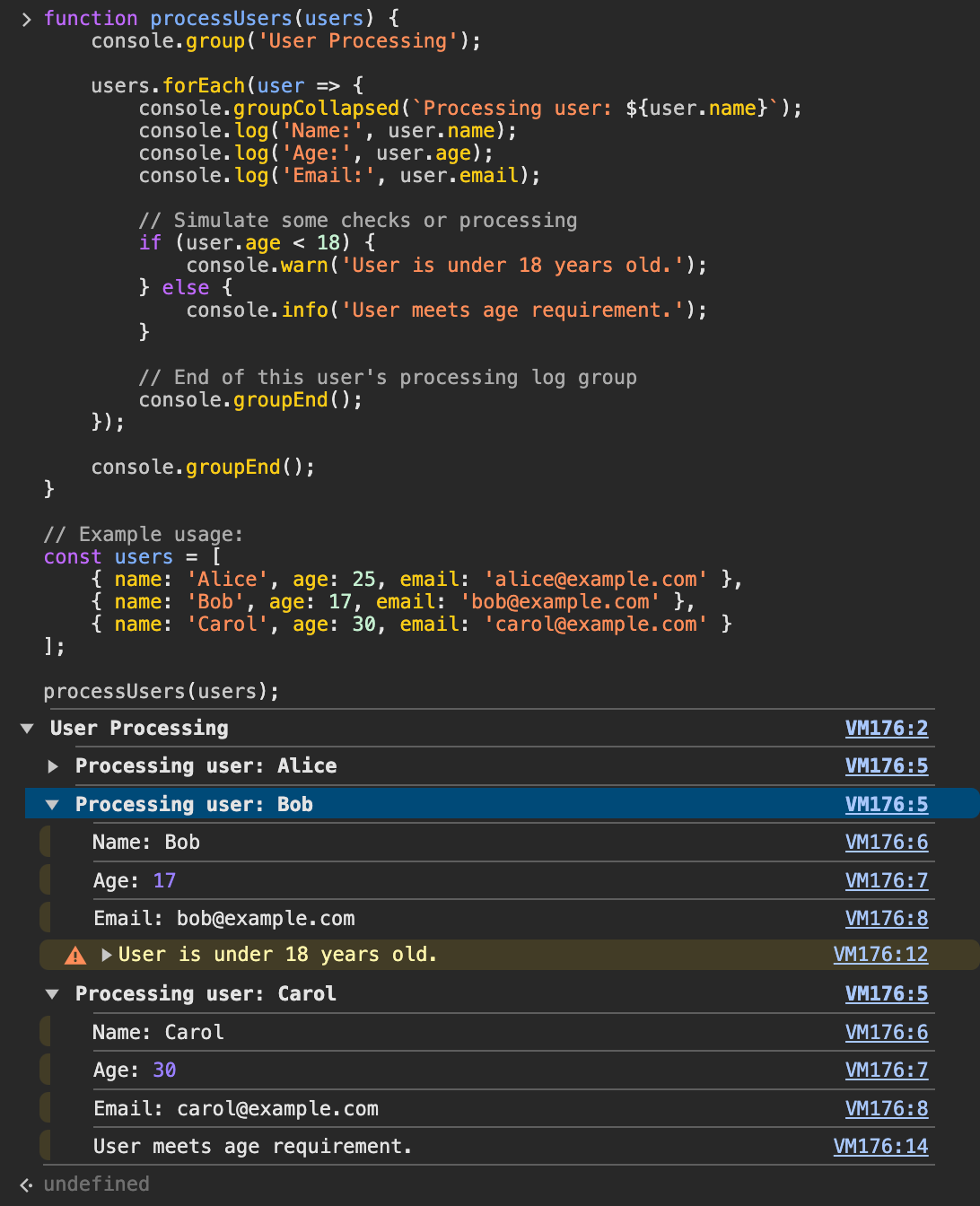 console.group() and console.groupEnd()