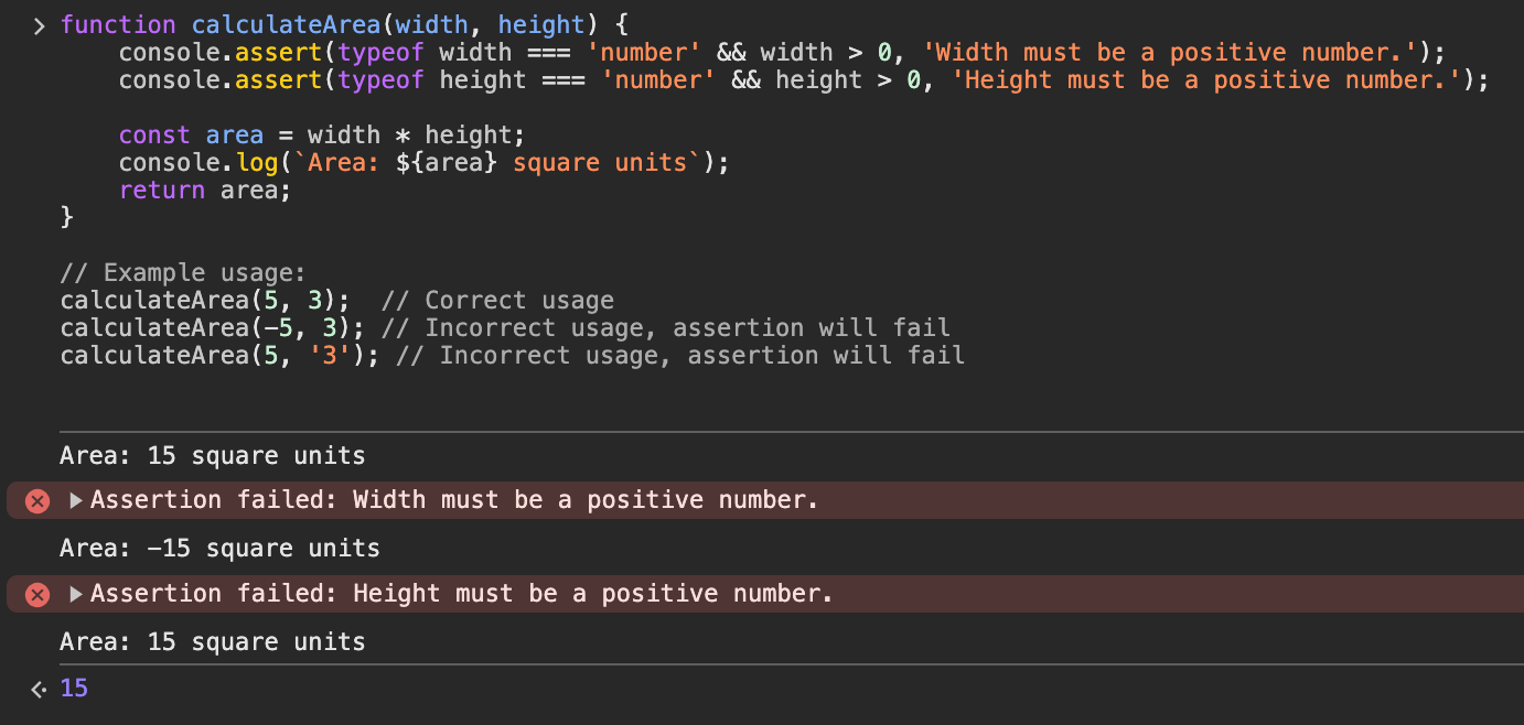This command shows an error message in the console if something you check is false. Use it to make sure things are working right as your code runs.