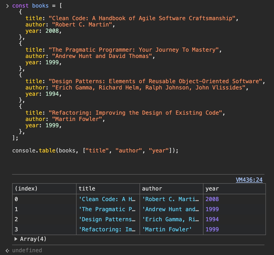 This command shows arrays or objects in a table format. It's great for looking at large sets of data clearly.